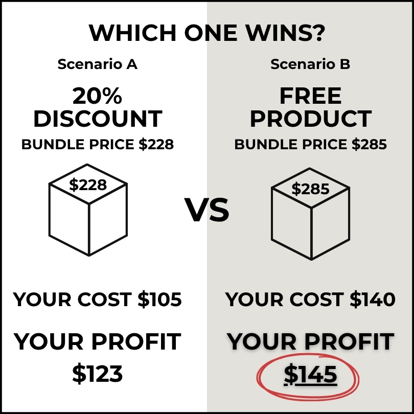 The results? In Scenario A the discount promotion costs you $57 (the 20% price discount) and leaves you with $123 profit. The Scenario B promotion meanwhile costs you only $35 (the cost of the product) while leaving you with a $145 profit.